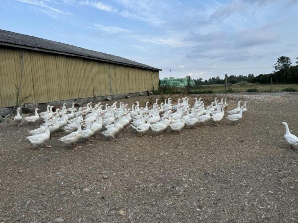 På vores gård lever de fritgående økologiske hvide gæs et godt og naturligt liv.